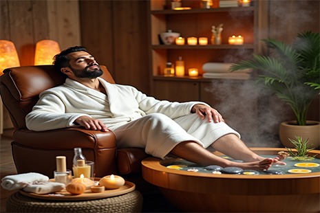 Foot spa soak in warm water with sea salt rock, followed by exfoliating, grooming, and massage with a heated footspa, giving your tired feet ultimate pampering, detoxing, pure relaxation, and soothing stress relief.